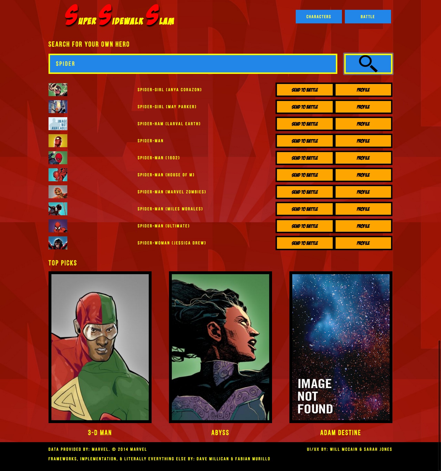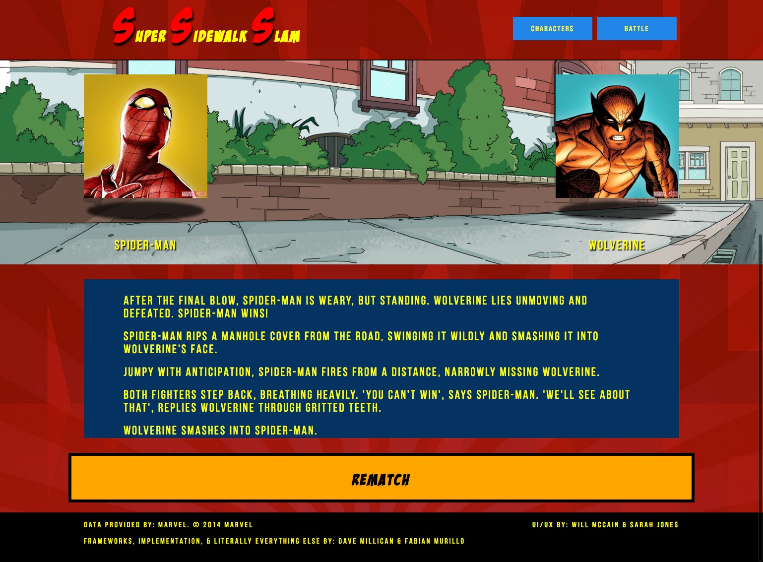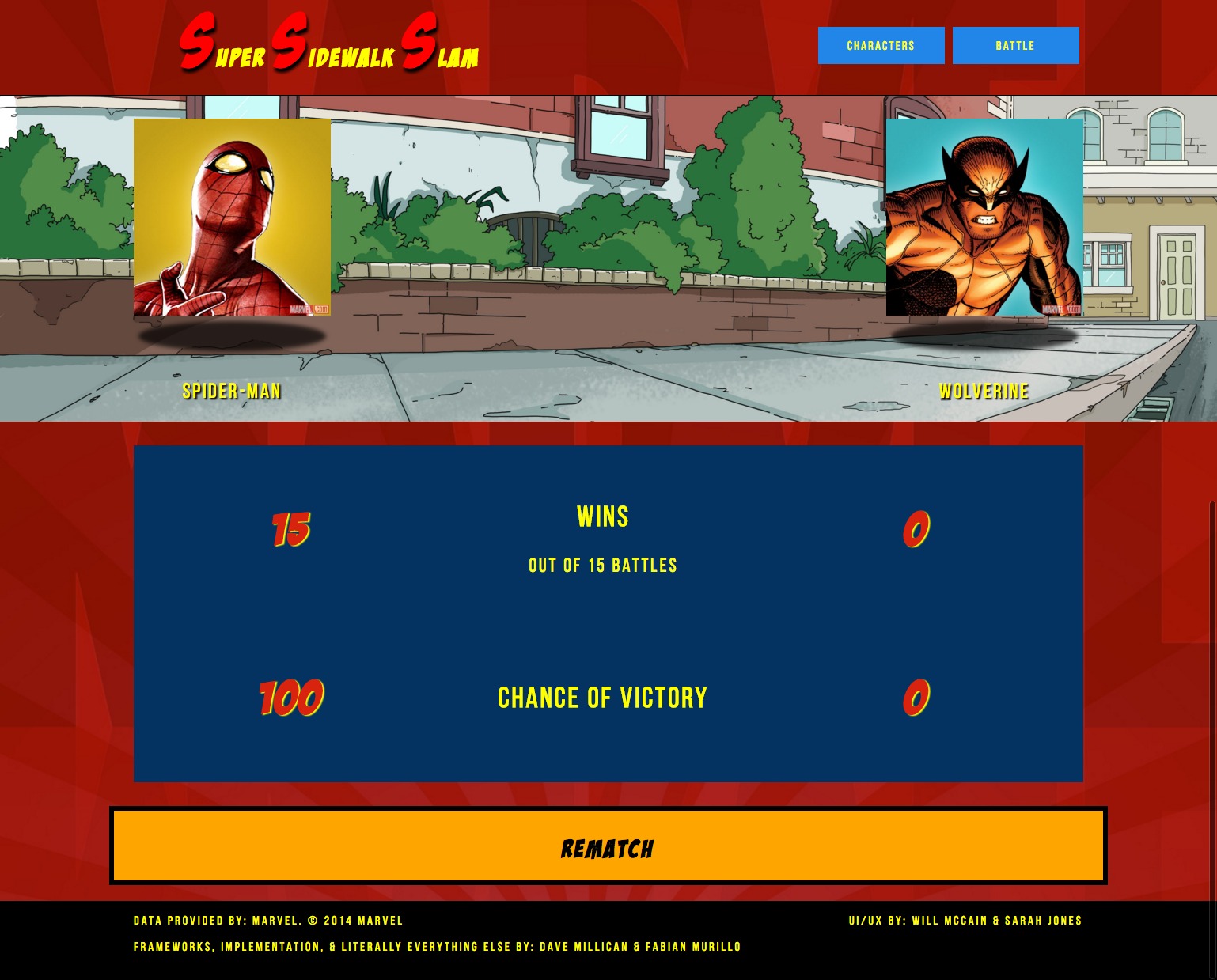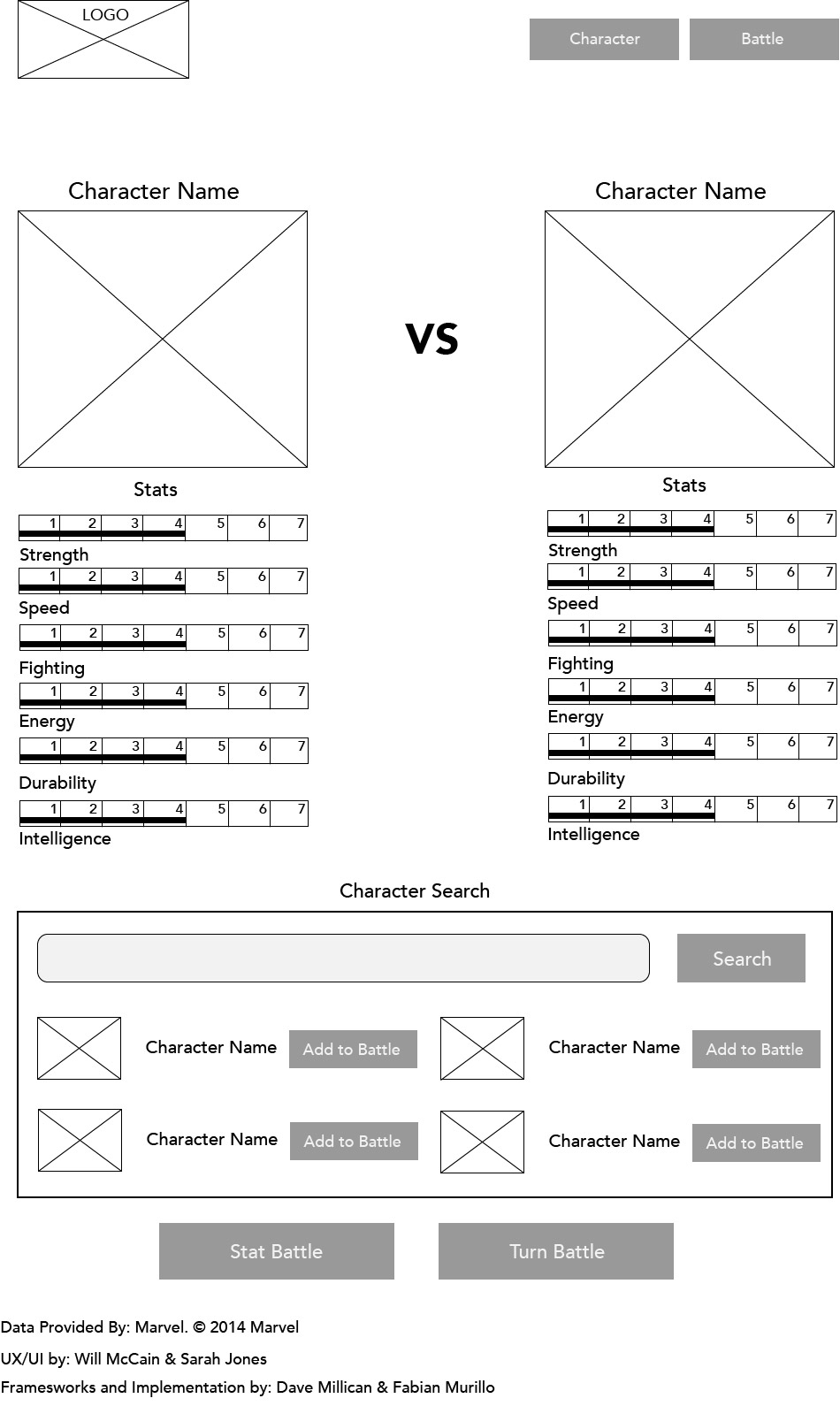 As a collaborative project, I, along with another designer and some developers, were tasked with designing and building a web app that would let you simulate fights between Marvel characters. We would be pulling the pictures, information, and ability stats from Marvel's very handy online API.